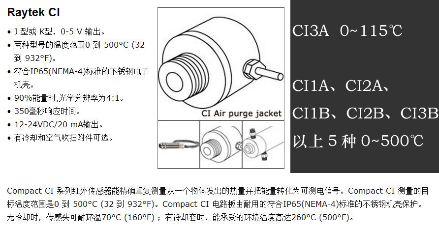 ●Compact CI系列测温仪具有坚实、耐用的低成本传感头,可提供先进的红外温度测量性能,标准4线制设计。当测温时有噪声干扰或要求很长的电缆时,CI系列可取代传统的接触热偶探针,并带J或K型热偶输出或0~5V输出